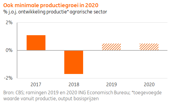 Ook in 2020 is de productiegroei van de agrarische sector volgens ING met +0,5% aan de lage kant. De groei wordt vooral in de intensieve veehouderij geremd door productieplafonds en het stikstofbeleid. Er zijn nog veel onduidelijkheden, zodat ook 2020 voor vele veehouders een spannend jaar gaat worden. Voor akkerbouwers, tuinders en groentetelers lijkt het ondernemersklimaat iets rustiger.