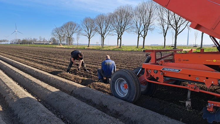 Achter de met ruim anderhalve ton gevulde Structural loopt monteur Merijn van der Zee van Pommeq. Hij houdt de machine nauwlettend in de gaten. Af en toe stopt Meerse even om zelf het resultaat te bekijken en samen met Van der Zee de machine nog wat verder af te stellen. “Bij een gereviseerde machine komen we altijd even helpen om hem in het werk te stellen. Dat is makkelijker dan telers telefonisch te moeten helpen”, legt Van der Zee uit.