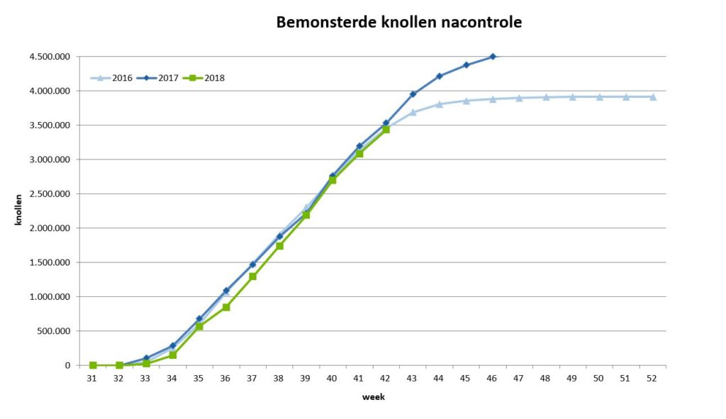 De bemonstering voor de nacontrole verloopt goed, ondanks dat er op dit moment veel heronderzoeken worden aangevraagd en onderzocht. Ongeveer 78% van de partijen is bemonsterd. De grafiek ‘bemonsterde knollen nacontrole’ geeft een indruk van de voortgang van het aantal bemonsterde knollen in vergelijking met voorgaande jaren.