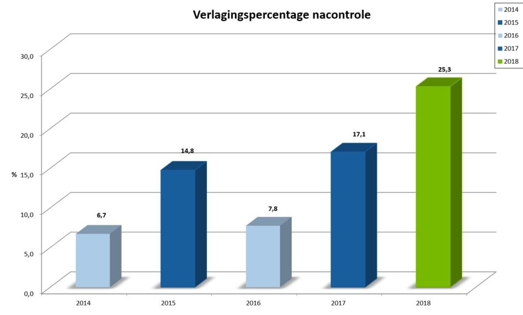 Het verlagingspercentage is ten opzichte van vorige week met 0,1% gestegen en staat nu op 25,3%. Dit betreft 70,5% van de te onderzoeken oppervlakte. De NAK ziet nog geen toename van vrijwillige onderzoek voor de partijen die hebben afgezien van nacontrole, waarvan het pootgoed bestemd is voor uitplant op het eigen bedrijf in 2019. Gezien het grote aantal verlagingen is het uitvoeren van een vrijwillig onderzoek toch de overweging waard, dit om teleurstellingen in de nateelt te voorkomen.