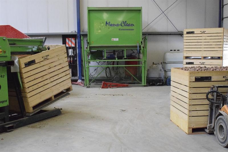Het wordt steeds belangrijker om aardappelkisten voor nieuwe vulling grondig te reinigen. Tijdsdruk tijdens het sorteren zorgt ervoor dat dit tijdrovende klusje pas na afloop weer wordt uitgevoerd. Mechanisatiebedrijf Veenma uit Dokkum ontwikkelde daarom een geheel automatisch systeem dat werkt op basis van een gesloten kubus met een gesloten waterafvoer. Hiermee worden de kisten in no-time gereinigd zonder dat de chauffeur van de heftruck af hoeft. Gerard Sijtsma, salesmanager bij Veenma Dokkum: “Zo kan je tientallen kisten per dag reinigen.”
