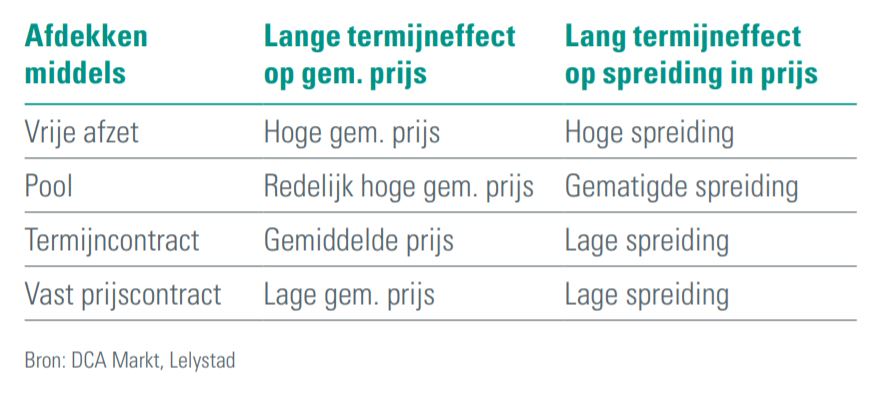 De akkerbouwer kan het totale risico beïnvloeden door in meer of mindere mate de prijs vooraf vast te leggen, zoals bijgaand staatje aangeeft. Hoe vaster de afspraken, hoe minder de agrariër te maken heeft met de actuele marktprijs. In tijden van hoge marktprijzen loopt hij winst mis, in tijden van lagere prijzen profiteert hij.