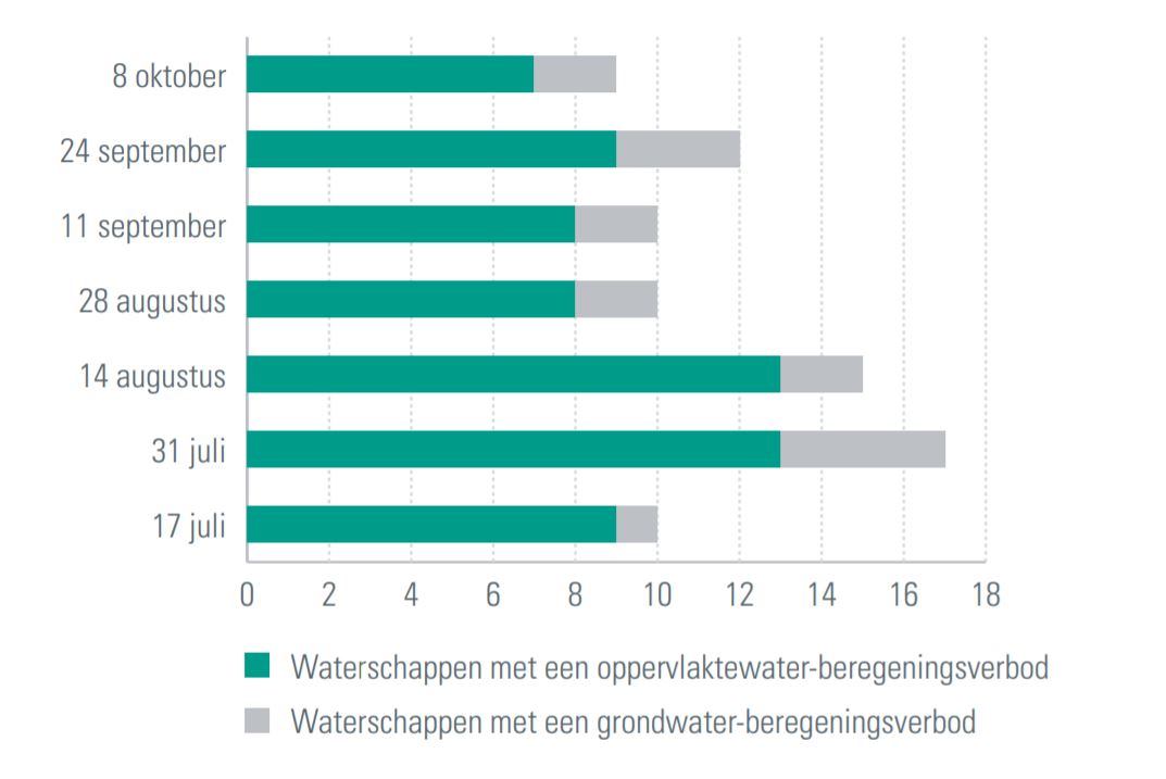 Vier zandgrond-waterschappen (Vechtstromen, Rijn & IJssel, Brabantse Delta, De Dommel) gingen bovendien zover dat ze lokaal verboden afvaardigden op het ont – trekken van grondwater voor beregening, daar waar landbouwgrond grenst aan natuurgebieden. Deden ze dat niet, dan zou de grondwaterstand daar zakken dat de natuur onherstelbaar beschadigd zou worden. Volgens de Waterwet1 heeft grondwaterpeilbehoud in natuurgebieden bij droogte voorrang op tijdelijke beregening van naburige landbouwgewassen.