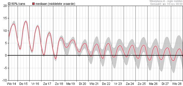 Ook in de pluim zien we het koude weerbeeld terug met maxima rond 5 graden. Normaal voor eind november is zo'n 8 graden.