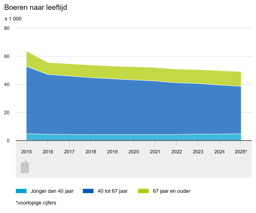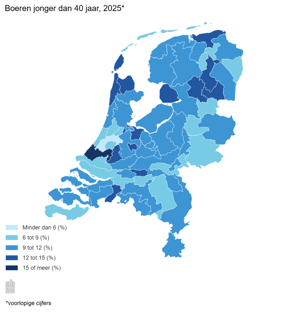 In 2025 zijn er bijna 5 duizend landbouwbedrijven met een bedrijfshoofd of bedrijfsleider jonger dan 40 jaar, 10 procent van het totaal. Het totaal aantal land- en tuinbouwbedrijven daalt al enkele decennia. De bedrijven worden wel steeds groter. Een groot deel van de landbouwbedrijven heeft geen bedrijfsopvolger. In de tuinbouwsector is het aandeel jonge boeren het grootst (13 procent), gevolgd door de hokdierbedrijven (12 procent).