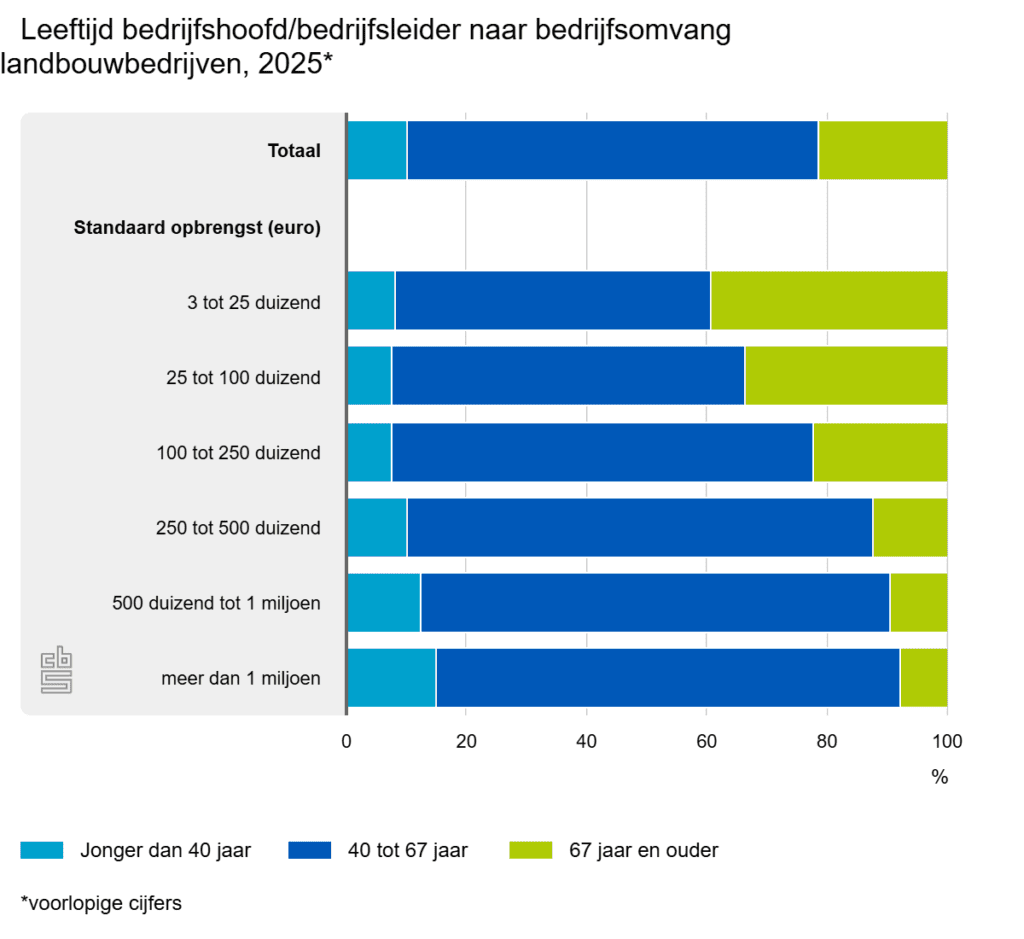 Grote bedrijven met een Standaard Opbrengst (SO) van 500 duizend euro of meer hebben relatief vaker een jong bedrijfshoofd of bedrijfsleider. In 2025 zijn er bijna 15 duizend landbouwbedrijven met een SO van 500 duizend euro of meer. Bij 14 procent van deze bedrijven staat een boer jonger dan 40 jaar aan het roer. Met bijna 9 procent is het aandeel boeren van 67 jaar of ouder in deze omvangsklasse het kleinst.