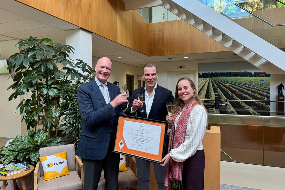 Op de foto v.l.n.r: vakjuryvoorzitter Niels Onkenhout, CEO Hans Meeuwis en directeur Romy Blankenspoor. Bron: Cosun