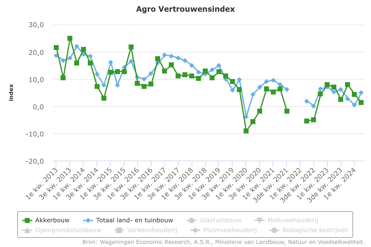 Akkerbouwers hebben het tweede kwartaal van 2024 minder vertrouwen in hun eigen onderneming dan een kwartaal eerder. Het vertrouwen is met 3 punten gedaald naar 1 punt. Het vertrouwen ligt onder het langlopend gemiddelde. De stemmingsindex halveert ruim naar 11 punten, terwijl de index met betrekking tot de verwachte situatie op het bedrijf voor over 2 à 3 jaar met 6 punten steeg naar -8 punten. Beide indicatoren vormen samen de Agro Vertrouwensindex.