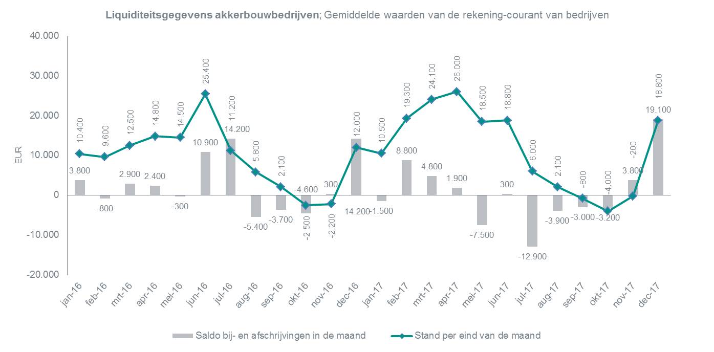 De ontwikkeling van de stand op de lopende rekening is een resultante van bij- en afschrijvingen. Ook neveninkomsten en privé-uitgaven zijn verwerkt. In april 2017 was de stand met EUR 26.000 het hoogst. Het laagst punt lag in oktober. De grootste negatieve mutatie van het saldo lag met EUR –12.900 in juli 2017. De verwachting is dat de stand van de rekening courant voor akkerbouwbedrijven de komende maanden zal verslechteren ten opzichte van vorig jaar vanwege eerdergenoemde lage productprijzen. Producten zullen, waar mogelijk, zo lang mogelijk bewaard worden. Dit betekent een verdere daling van de RC. We verwachten dat veel ondernemers in de akkerbouw een pas op de plaats zullen maken met het doen van investeringen. Mogelijk zullen op sommige bedrijven liquiditeitstekorten ontstaan. Echter de akkerbouwsector gewend is aan volatiliteit en ondernemers kijken in de regel verder dan één oogstjaar.