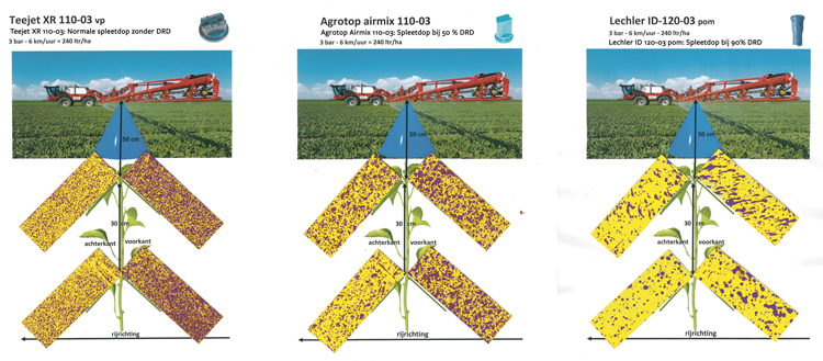 Weergave van bedekking met conventionele spuittechniek (links) en driftreducerende doppen waarbij de bedekking duidelijk minder is (rechts) en hulpstoffen noodzakelijk zijn.