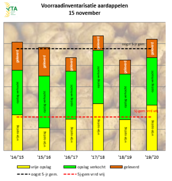 In november was 16,6% van de oogst afgeleverd. In absolute tonnen hebben de deelnemende telers 33,2% meer afgeleverd dan vorig seizoen. Dit is 6,8% minder dan het 5-jarig gemiddelde. De absolute voorraad die nu in opslag ligt bij de vaste groep van telers is fors hoger dan vorig seizoen (21,1%) en ook hoger dan het 5-jarig gemiddelde (12,9%). Van de voorraad in opslag is 51% al verkocht. Vorig jaar was 59% verkocht.