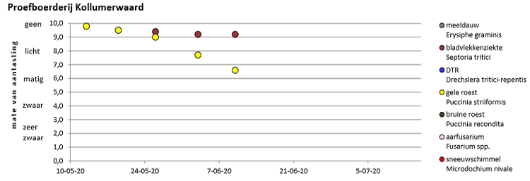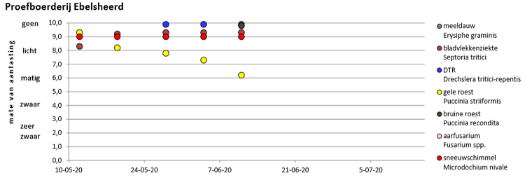 Op beide locaties is de aantasting van gele roest weer iets toegenomen. In de aantasting van septoria is ten opzichte van vorige week niks veranderd. Op Ebelsheerd is in het ras Bergamo een beginnende aantasting van bruine roest waargenomen.