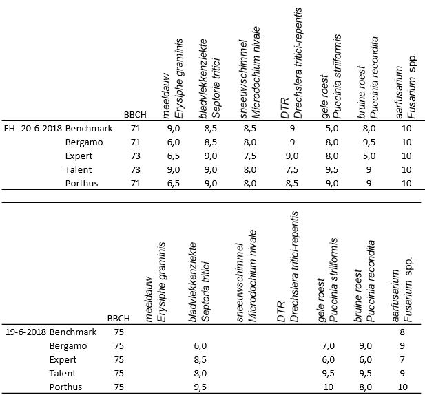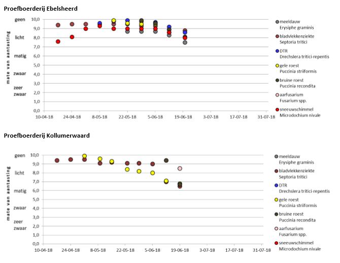 Alle ziekteaantastingen zijn afgelopen week toegenomen, op beide locaties. Met name de aantastingen van bruine roest zijn uitgebreid, maar op Ebelsheerd is ook meeldauw toegenomen in de rassen Bergamo en Porthus. Met name Bergamo laat een matige aantasting zien. Ook sneeuwschimmel breidt zich op de Ebelsheerd sterk uit. Verder is op de Kollumerwaard ook aarfusarium waargenomen.