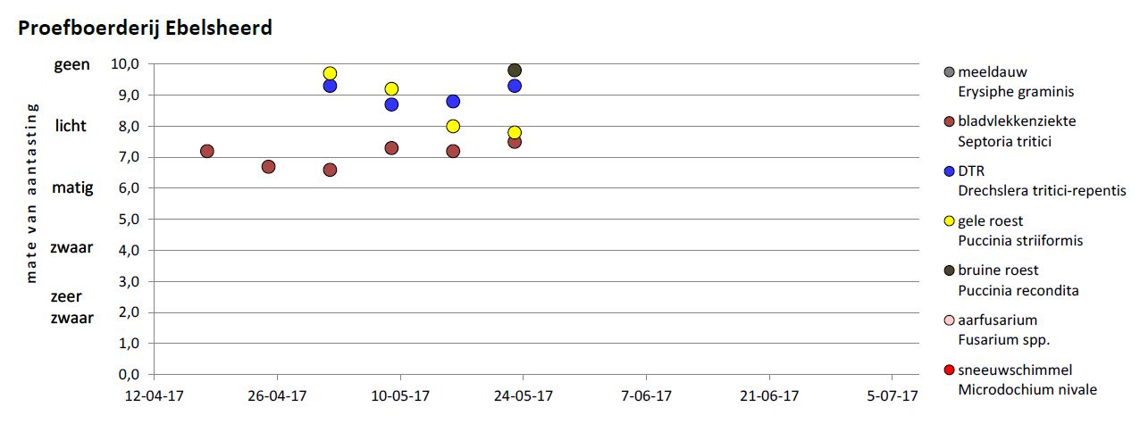 De aantasting van gele roest is op beide locaties weer licht toegenomen. Op Kollumerwaard is nu ook gele roest te zien in het ras Bergamo. Op Ebelsheerd is in Bergamo een beginnende aantasting van bruine roest waargenomen. De vlekjes zijn nog klein, maar onder de microscoop zijn er reeds sporen te zien. De aantasting van septoria blijft tot nu toe redelijk gelijk. Bij alle rassen is inmiddels het vlagblad uitgerold.