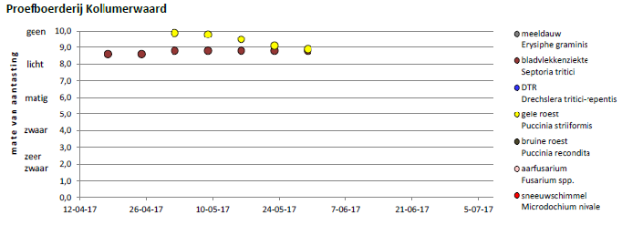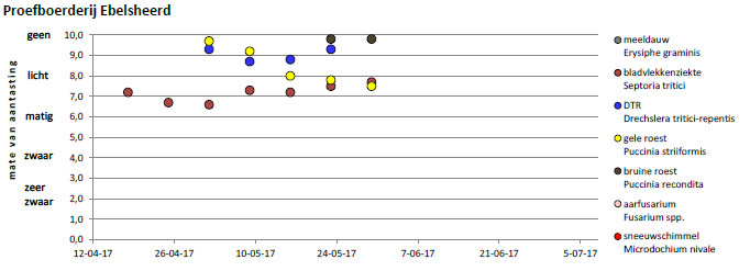 Deze week is alleen de aantasting van gele roest weer licht toegenomen. Op Ebelsheerd heeft de aantasting van DTR niet door kunnen zetten. Daarom wordt deze in de grafiek niet meer weergegeven. Inmiddels zijn de aren voor 50-80% uitgeschoven.
