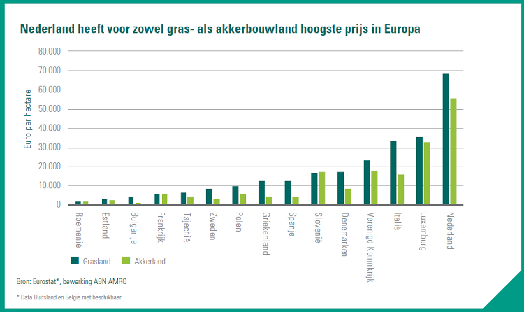 Nederland heeft in vergelijking tot andere Europese landen een flink hogere landbouwgrondprijs. De prijs van zowel grasland als akkerbouwland ligt hoger, zoals in onderstaande grafiek te zien is. In Duitsland (niet in de grafiek opgenomen) zijn de prijzen in het oosten veel lager dan in het westen, waar ze soms die van Nederland benaderen.