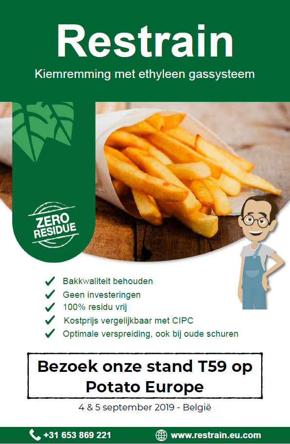 Garos: “Het succes van Restrain is de eenvoud en betrouwbaarheid van het systeem. In slechts vijf minuten is het systeem geïnstalleerd in de bewaring. Door gebruik van een Restrain Generator en sensor wordt een zeer lage concentratie ethyleengas aangevoerd. Het dynamische ethyleengas weegt ongeveer hetzelfde als lucht en verspreidt zich zodoende over al de aardappels, zowel in bulk als in de kistenbewaring. Het gaat nu heel hard met die vraag. Friet, chips, tafel- en zetmeelaardappelen: eigenlijk alles wat met aardappelbewaring te maken heeft, toont interesse. Er zijn wel alternatieven beschikbaar, maar nadelen daarvan zijn dat ze niet in alle landen zijn toegelaten en moeilijker toepasbaar zijn. Ook moet je de bewaarschuur hermetisch afgesloten houden, anders gaat het middel weg. Daar hebben we met ethyleen geen last van. Daarnaast zijn we ook nog eens vier tot zes keer goedkoper dan elk alternatief van CIPC.”
