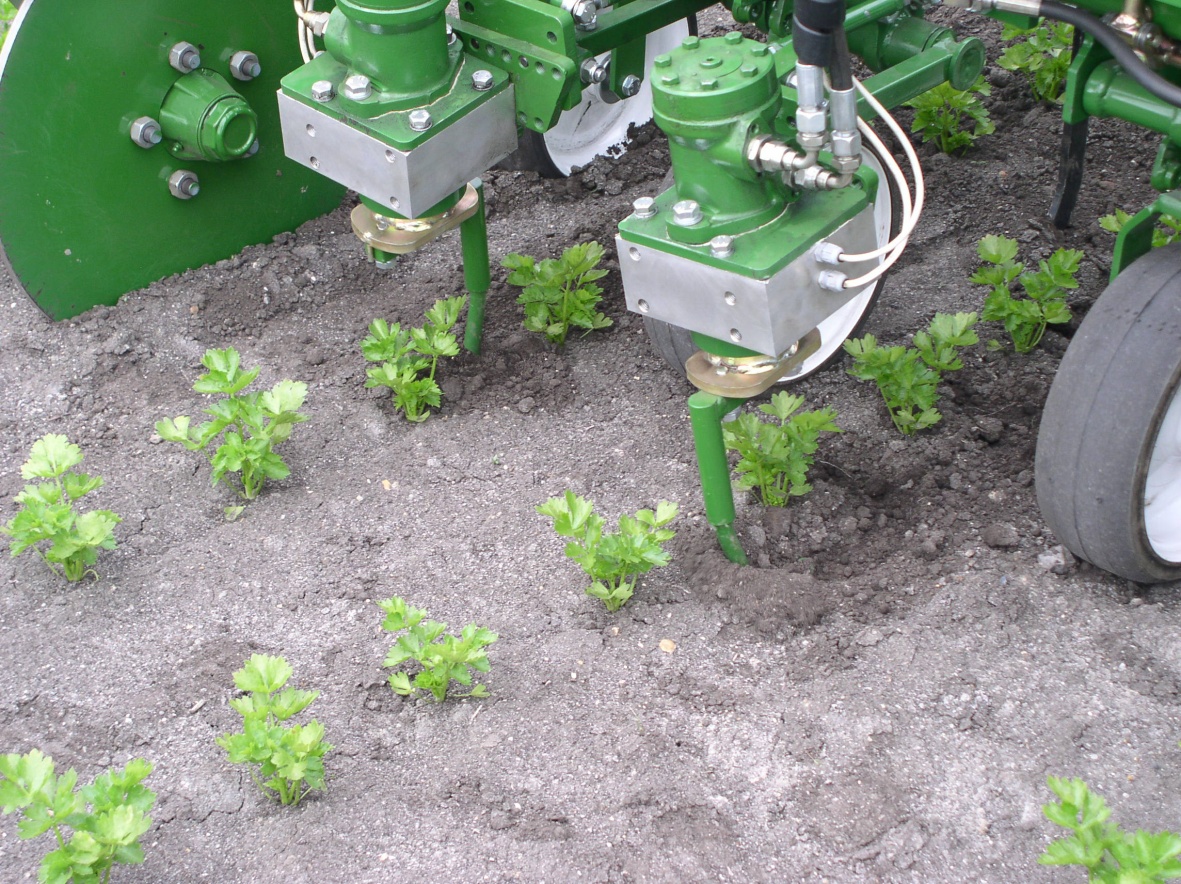 Robocrop Precision Guided High Speed Schoffel: een digitale video camera legt het gewas vast voor de schoffelmachine. De beelden worden geanalyseerd om de positie van de individuele plant te bepalen om de machine over de exacte gewaslijn te sturen door het aansturen van de hydraulische sideshift.