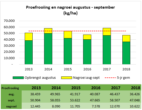 Verder bestaan er natuurlijk verschillen tussen de rassen. Omdat er van enkele rassen slechts enkele monsters waren ingediend zou het statistisch niet juist zijn om hier keiharde conclusies uit te trekken. Bij de berekening van de totale nagroei hebben we een gewogen gemiddelde berekend. Deze bedraagt 10.622 kg/ha. Gemiddeld over de 5 voorgaande jaren lag de nagroei in dezelfde periode op 10.378 kg/ha.