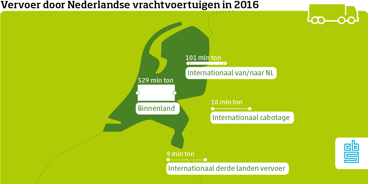 De hoeveelheid goederen vervoerd door het Nederlandse beroepsvervoer (wegtransport voor rekening van derden) steeg in 2016 met bijna 4 procent naar 513 miljoen ton. Het eigen vervoer (wegtransport voor rekening van het bedrijf zelf) daalde juist met 1,5 procent. Het vervoerd gewicht door beroepsvervoerders neemt al voor het vierde jaar op rij toe. Van elke honderd ton vervoerd gewicht door Nederlandse vrachtauto’s komen er bijna tachtig voor rekening van beroepsvervoerders.