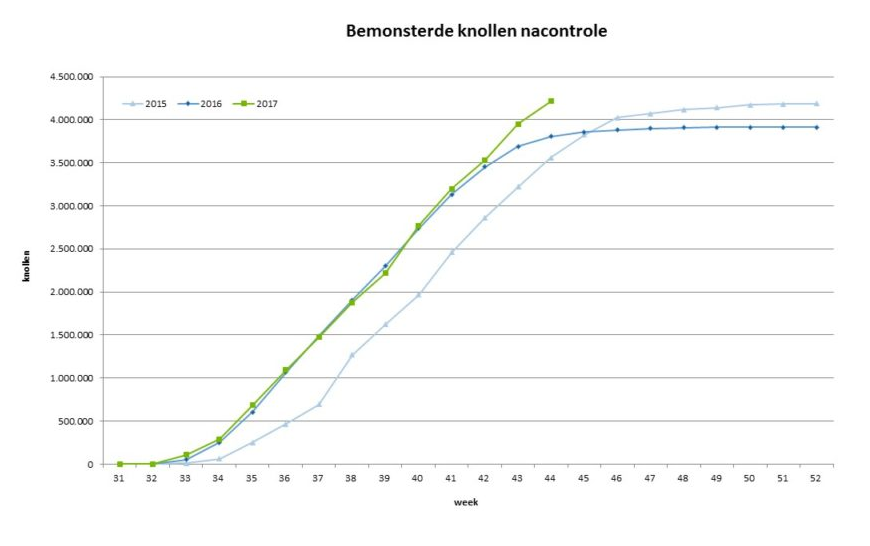 Zoals verwacht is de aantasting van aarfusarium sterk toegenomen. In het ras Tobak is zelfs tot 25% van de aren aangetast. Maar ook de (op papier) minder vatbare rassen Elixer en Expert zijn niet vrij van Fusarium. Verder is bruine roest ook verder toegenomen. Ook hier zijn de rassen Tobak en Elixer het zwaarst aangetast. De tarwe staat deze week in het stadium van deegrijping.