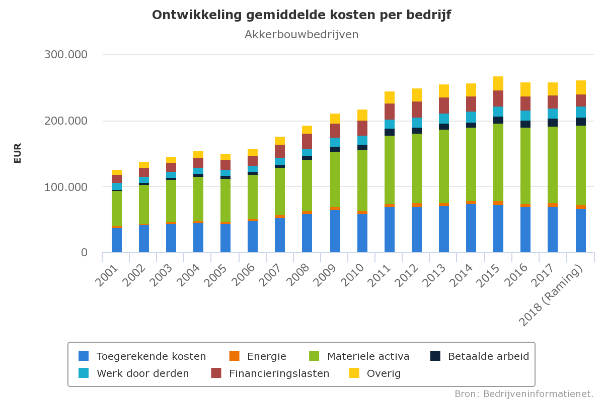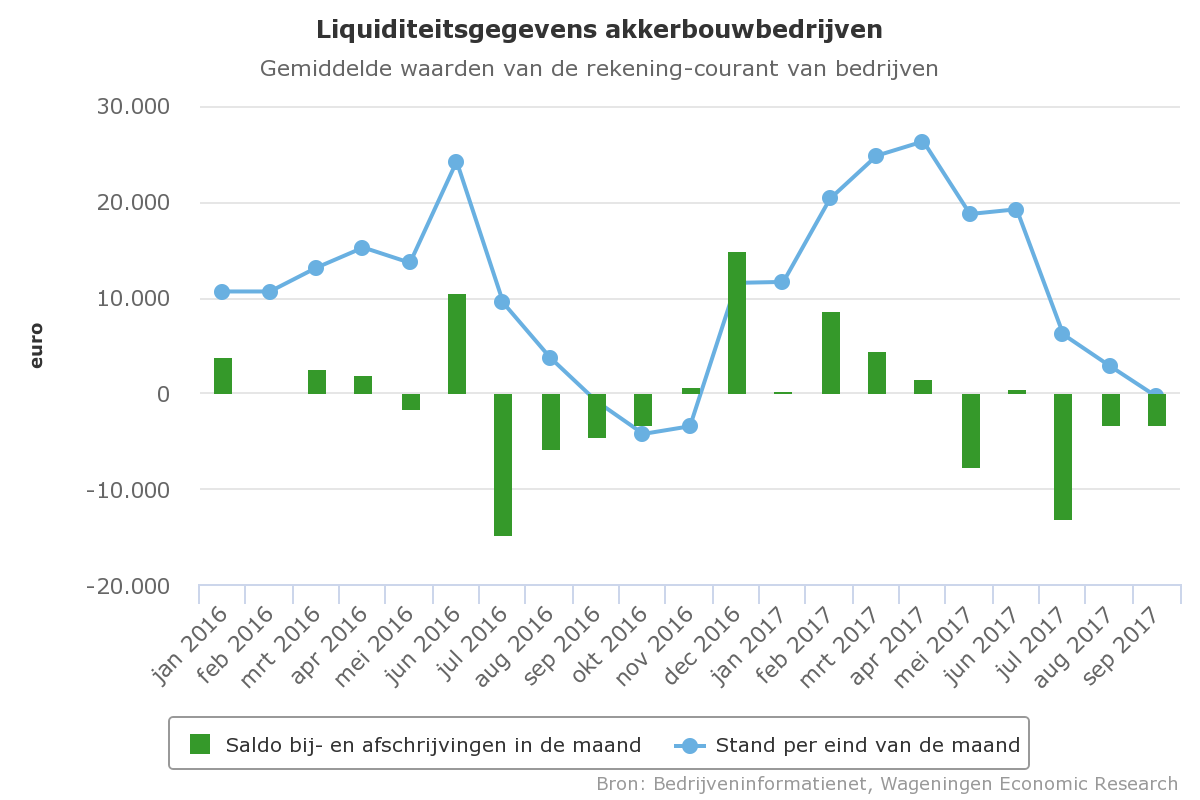 De rekening-courant positie op akkerbouwbedrijven is in 2017 beter dan het jaar ervoor. Met name in de periode februari tot en met mei was het saldo op de bank gemiddeld duidelijk hoger dan in het voorgaande jaar. In oktober 2016 werd het minimum bereikt. Daarna nam het saldo flink toe door uitbetaling van bedrijfstoeslagen (december) en de ontvangsten voor de gewassen (februari en maart). In april 2017 was het saldo het hoogst om vervolgens te zakken vanwege de uitgaven voor de teeltwerkzaamheden.