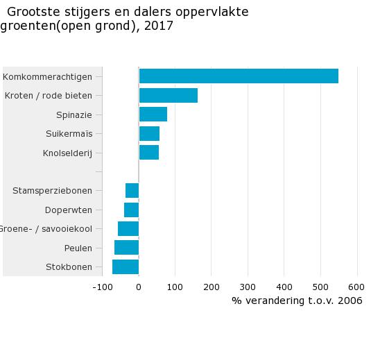 Van alle groentes steeg het areaal komkommerachtigen, zoals courgettes en pompoenen, relatief het hardst. Sinds 2006 is dat areaal met duizend hectare toegenomen naar 1 170. Van de grond die gebruikt wordt voor de teelt van groenten nemen de komkommerachtigen met 1,3 procent echter een beperkt deel in beslag.