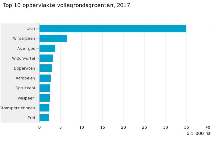 Geen groente wordt in ons land zo vaak geteeld als de ui. In 2017 besloeg het areaal uien bijna 35 duizend hectare, 40 procent van het totale areaal vollegrondsgroenten. In 2006 was nog 32 procent van de land- en tuinbouwgrond voor groenten gereserveerd voor de ui. Vergeleken met 2006 is het areaal uien met 42 procent toegenomen.