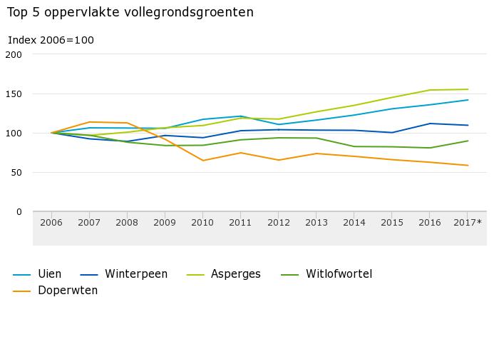 Na de ui is de winterpeen de groente met het grootste areaal. De omvang nam sinds 2006 met 9,6 procent toe naar meer dan 6 500 hectare.