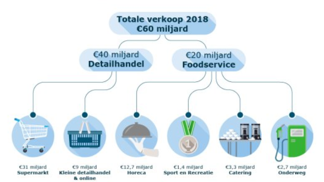 In 2018 kopen Nederlandse consumenten voor circa 60 miljard euro aan eten en drinken in detailhandel (voornamelijk supermarkten) en foodservice (voornamelijk horeca). Dat is een stijging van 2,5% ten opzichte van 2017.
