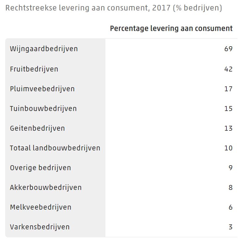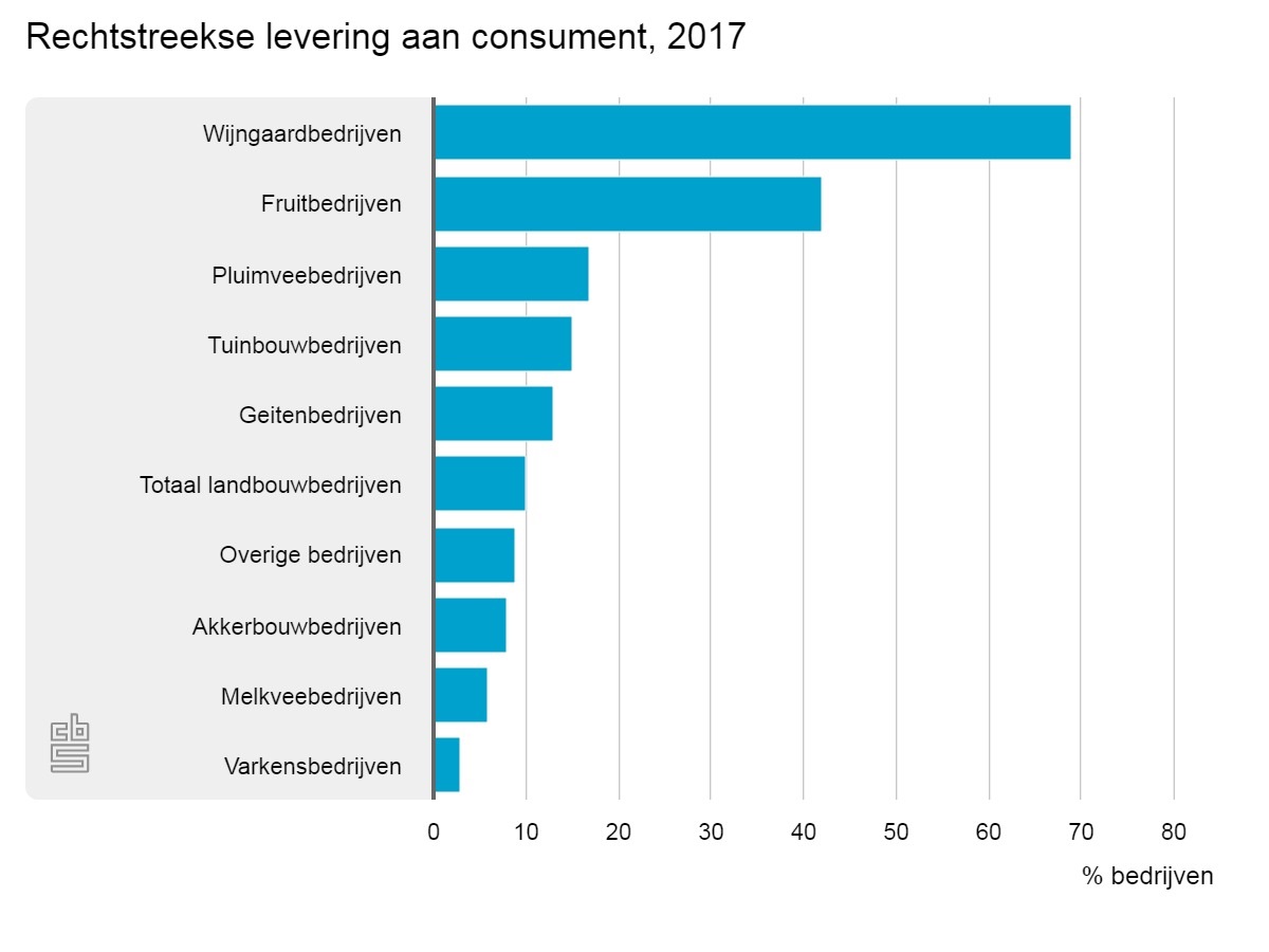 Van de ruim 5 700 landbouwbedrijven (10 procent) die rechtstreeks of via één tussenschakel leveren aan de consument, haalt 43 procent de helft of meer van de bruto opbrengst uit deze directe verkoop. Bij geitenbedrijven is dat met 61 procent het hoogst. Bij melkveebedrijven is het 57 procent en bij wijngaardbedrijven 55 procent.