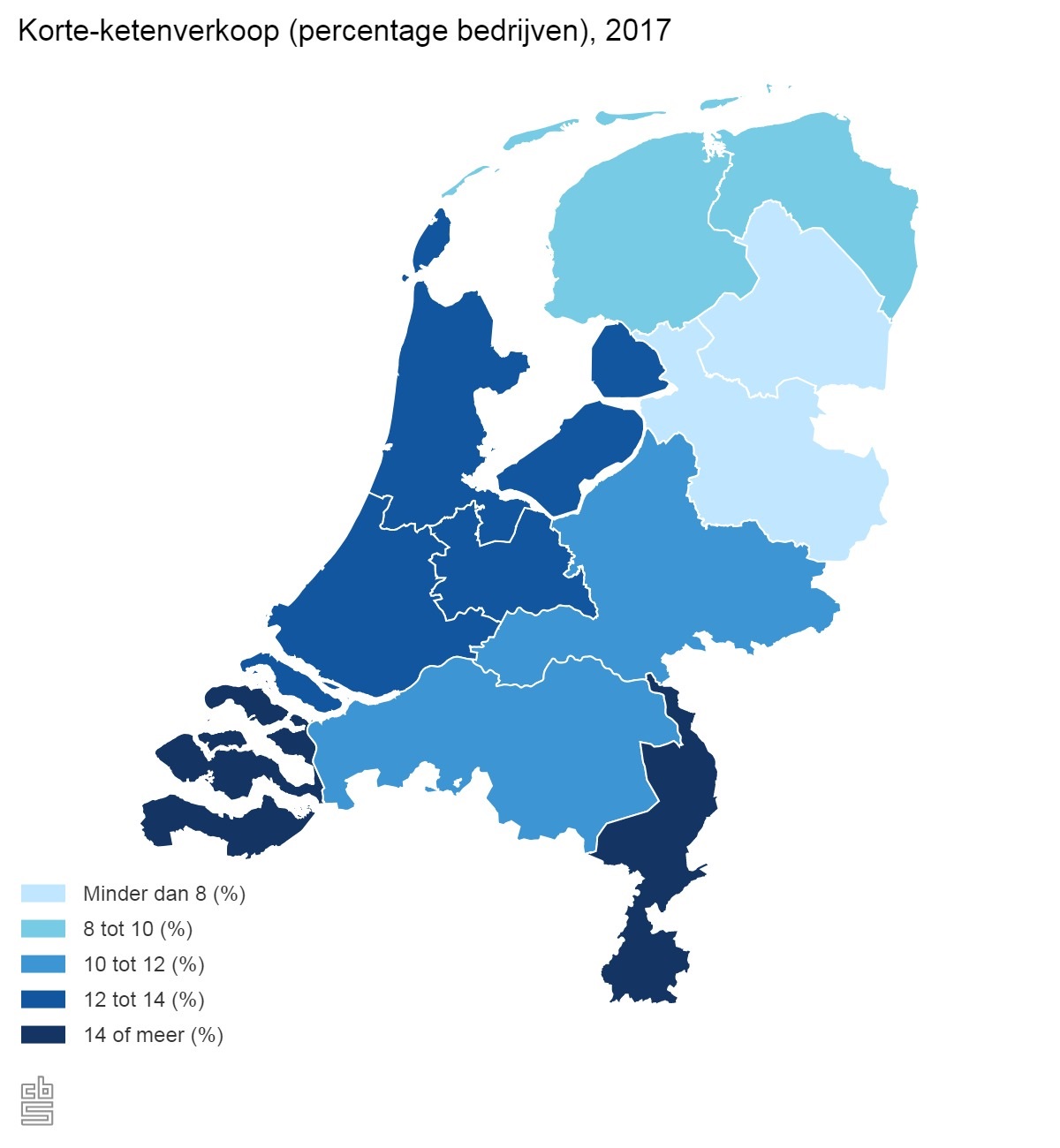 Het aandeel landbouwbedrijven met korte-ketenverkoop is het grootst in Limburg (15 procent) en Zeeland (14 procent). Boeren in Drenthe en Overijssel leveren relatief het minst direct aan de consument (respectievelijk 7 procent en 6 procent).