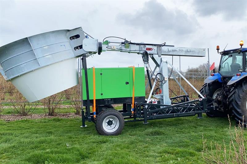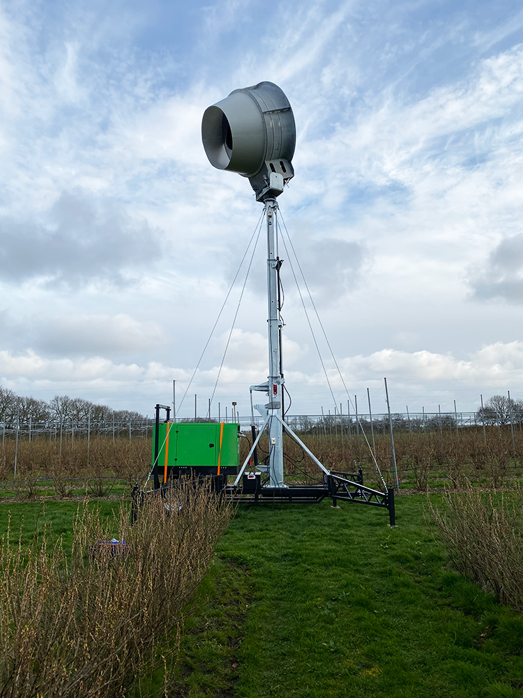 De ZIBO Nachtvorstventilator wordt hydraulisch bediend en is voorzien van steunvoeten voor stabiele plaatsing. Met behulp van een ingebouwde temperatuurmeter start de ZIBO Nachtvorstventilator automatisch als de weerssituatie daarom vraagt. De fruitteler blijft op de hoogte middels dankzij een app-notificatie.