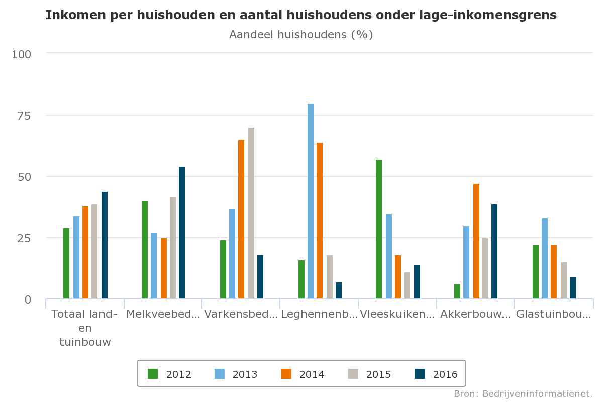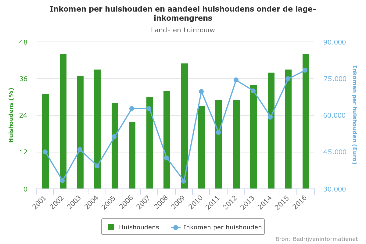 Sinds 2001 moet jaarlijks minimaal 20% van de huishoudens in de land- en tuinbouw rondkomen van een inkomen onder de lage-inkomensgrens, voor 2016 overeenkomend met ongeveer 23.870 euro. In 2016 kwam dit percentage huishoudens uit op 44%, voor het vierde jaar op rij een stijging.