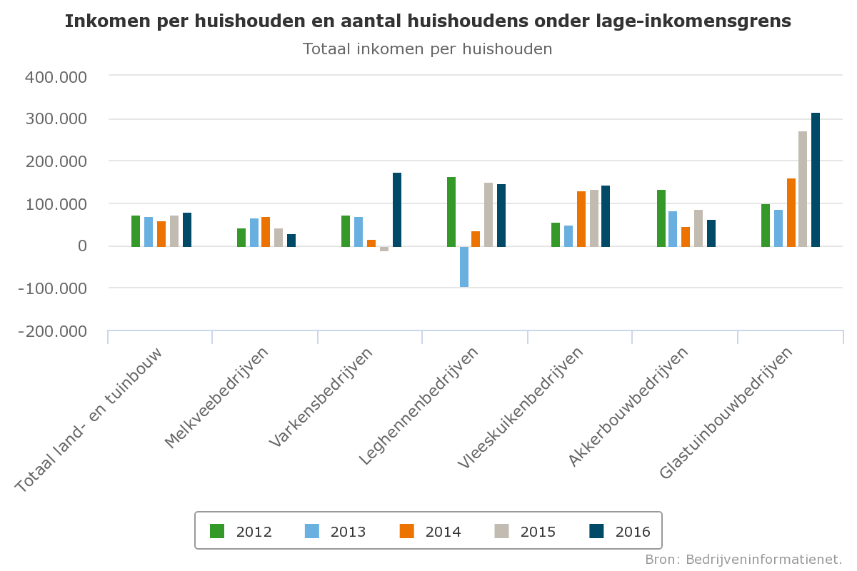 Er zijn grote verschillen in het aandeel huishoudens onder de lage inkomensgrens zowel tussen bedrijfstypen als bedrijfsgrootte. In de periode 2012-2016 is het aandeel huishoudens onder de lage inkomensgrens het kleinst in de glastuinbouw, veroorzaakt door de goede bedrijfsresultaten in de laatste paar jaar. De leghennenbedrijven hebben te maken met grote schommelingen in het aandeel van de groep met lage inkomens tussen de jaren. In 2013 en 2014 was het aandeel hoger dan gemiddeld.