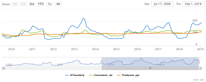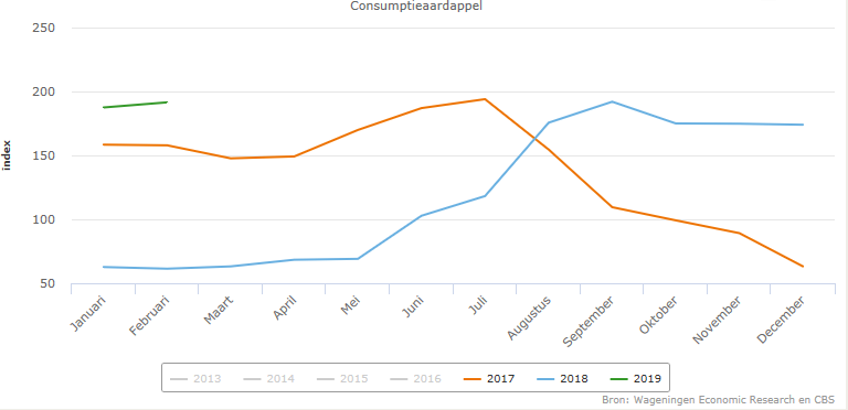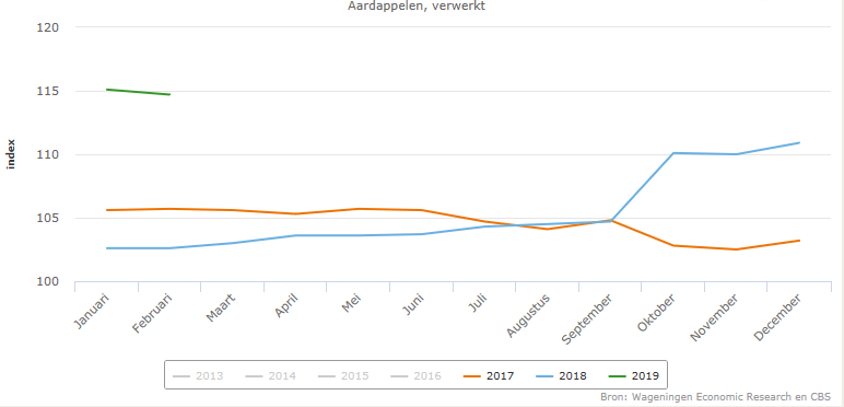 De consumentenprijsindex van aardappelen is in februari uitgekomen op 126 (2015=100), 17% hoger dan in februari 2018. De producentenprijsindex is de laatste twee maanden opgelopen naar 115 punten, 12% hoger dan vorig jaar. De aardappelprijs af boerderij is vanaf mei 2018 fors opgelopen naar 192 punten in februari, ruim drie keer het niveau van een jaar eerder. Verwacht wordt dat die prijs door de geringe oogst dit seizoen op een hoog niveau blijft.