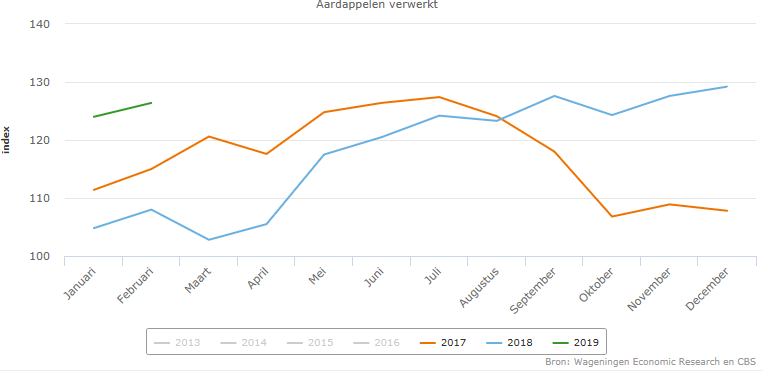 De producentenprijsindex (PPI) kwam in oktober 2018 met 110 punten (2015=100) op een stabiel hoger niveau dan de 103-4 punten van de periode ervoor. In de eerste twee maanden van 2019 zijn de producentenprijzen gestegen tot 115 punten in februari, 12% hoger dan een jaar eerder. De verwerkende industrie verwerkte over de periode december-februari minder aardappelen vergeleken met dezelfde periode een jaar eerder. Verwerkers kopen via contracten in, waardoor ze relatief stabiele verkoopprijzen kunnen hanteren. De Nederlandse aardappelverwerkende industrie verwerkt jaarlijks meer dan 4 miljoen ton aardappelen.