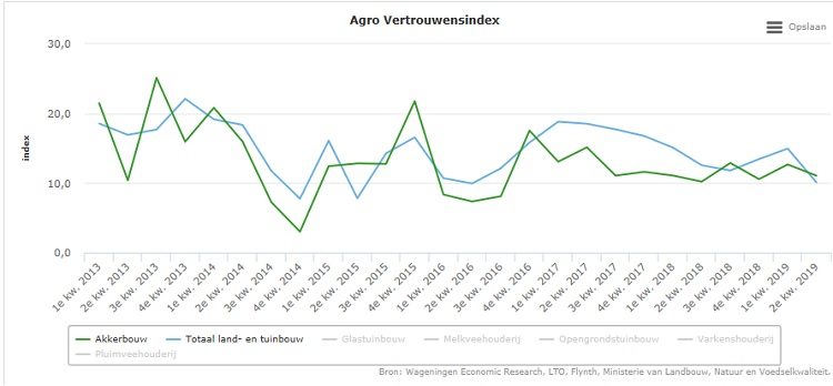 Het vertrouwen onder akkerbouwers is in het tweede kwartaal van 2019 met bijna 2 punten gedaald ten opzichte van het eerste kwartaal van 2019.