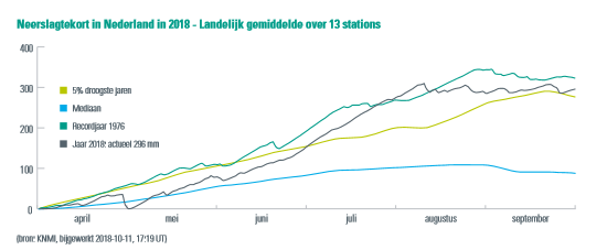 Het neerslagtekort ligt sinds eind juni boven het neerslagtekort van de 5% droogste jaren. Vanaf 1 oktober houdt het KNMI het neerslagtekort niet meer bij, omdat de verdamping nog maar klein is.