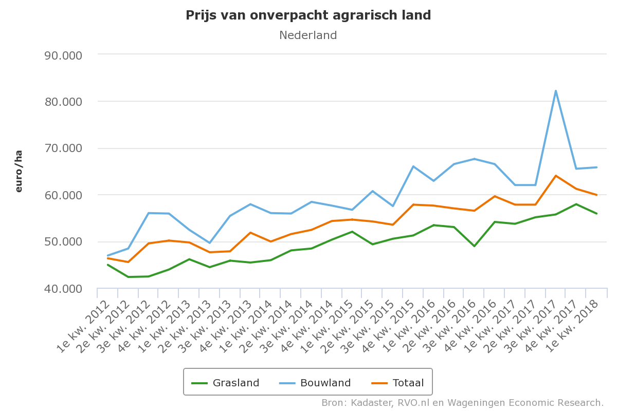 De gemiddelde agrarische grondprijs in Nederland is in het eerste kwartaal van 2018 uitgekomen op 59.900 euro per ha. Dat is vrijwel gelijk aan de gemiddelde prijs over heel 2017 (59.500 euro per ha), maar 2% lager dan de prijs in het vierde kwartaal van 2017 (61.200 euro per ha). De prijsdaling is bepaald door grasland.