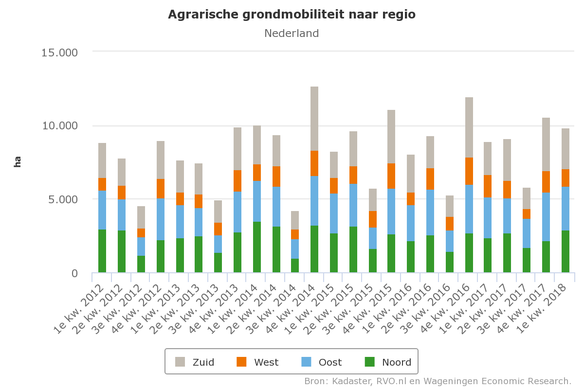In het eerste kwartaal van 2018 is 11% meer grond verhandeld dan in hetzelfde kwartaal het jaar daarvoor, respectievelijk 9.900 ha en 8.900. Door het seizoenspatroon – waarbij de handel in het derde kwartaal op een laag pitje staat – is een vergelijking met het voorgaande kwartaal niet zinvol. In de laatste vier kwartalen (2017Q2-2018Q1) is in totaal 35.300 ha verhandeld, wat vrijwel gelijk is aan de mobiliteit in dezelfde periode een jaar eerder (2016Q2-2017Q1). De relatieve grondmobiliteit – het verhandeld areaal afgezet tegen het totaal areaal landbouwgrond – komt uit op 2,0%.