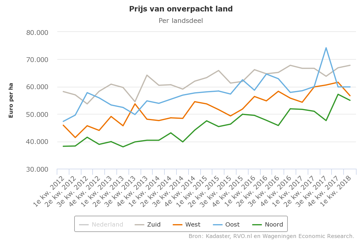 De gemiddelde agrarische grondprijs in landsdeel Noord is na de forse stijging in het laatste kwartaal van 2017, in het eerste kwartaal van 2018 licht gedaald (met 4%) tot 55.000 euro per ha. Dat is nog ruim 5% boven de grondprijs over heel 2017 van 52.200 euro per ha. In de laatste vier kwartalen (2017Q2-2018Q1) is in landsdeel Noord 9.500 ha landbouwgrond verhandeld. Dat is 350 ha (4%) meer dan het jaar daarvoor (2016Q2-2017Q1). De relatieve grondmobiliteit – het verhandeld areaal afgezet tegen het totaal areaal landbouwgrond – is toegenomen van 1,6% tot 1,7%.