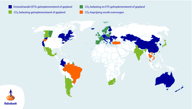 Figuur 1: CO2-beprijzingsinitiatieven bestaand of gepland, en overwogen (Bron: Rabobank)