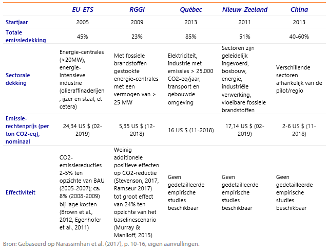 De wereld kent 25 emissierechtenhandelssystemen, vaak op regionaal niveau. Het EU-ETS-systeem is het tot nu toe grootste emissierechtenhandelssysteem ter wereld, maar zal nummer twee worden zodra het Chinese ETS-systeem is voltooid. Voorbeelden van andere ETS-systemen omvatten Zwitserland, de ‘Regional Greenhouse Gas Initiative’ (RGGI, Amerikaanse oostkust), Californië, Quebec, Nieuw-Zeeland en Korea. Tabel 1 geeft een overzicht van verschillende kenmerken van vijf van de genoemde emissierechtenhandelssystemen.