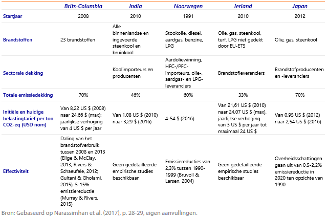 De wereld telt momenteel 26 CO2-belastingsystemen, vooral op nationaal niveau, zoals in Brits-Columbia, Mexico, Chili, India, Noorwegen, Zweden, Frankrijk, Ierland en Japan. Tabel 2 geeft een overzicht van verschillende kenmerken van zeven CO2-belastingsystemen.