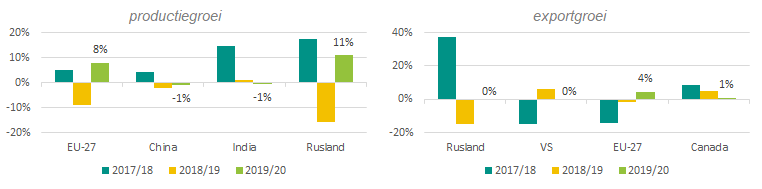 De EU, China, India en Rusland produceren gezamenlijk circa 60% van de mondiale output van tarwe. De grootste producent is de EU met een aandeel van 20% in de wereldproductie van tarwe. China volgt de EU echter op de voet met een aandeel van 17%. Vorig jaar was vooral de droogte in de EU een groot probleem voor de tarweoogst. Daardoor kromp de EU productie met 9%, maar dit waren exceptionele omstandigheden. Voor komend seizoen gaat de International Grains Council (IGC) uit van weer normale omstandigheden. De IGC verwacht dat de productie van tarwe in de EU komend jaar met 8% toeneemt. In Rusland stijgt de output met 11% iets harder, terwijl in China en India de productie krimpt. Per saldo gaat de mondiale output van tarwe volgend jaar toenemen met bijna 4%.