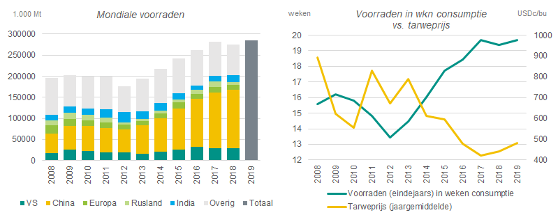Per saldo wordt er in het seizoen 2019/20 meer tarwe geoogst dan dat er in totaal wordt verbruikt. Het overschot wordt aan de voorraden toegevoegd en die stijgen met 3,6% op jaarbasis. Daarmee bereiken de voorraden een recordniveau. Kortom, de beschikbaarheid van tarwe blijft voorlopig goed. De meeste voorraden liggen in China en die nemen komend jaar toe, onder invloed van een hogere productie en groei van de import. In de VS dalen de voorraden voor de vierde opeenvolgende jaar.
