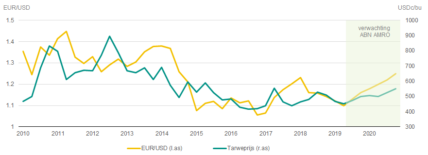 De verwachting van ABN AMRO is dat de dollar in 2019 afzwakt richting de EUR/USD 1,16. In 2020 verzwakt de dollar verder richting de EUR/USD 1,25. Dit komt mede doordat de eurozone-economie later in het jaar enigszins herstelt en de economie in de VS afkoelt. Omdat de trend in het aanbod van grote invloed is op de prijs, blijft het herstel van de tarweprijs echter beperkt.