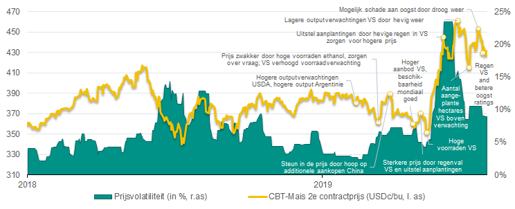 De USDA geeft aan dat halverwege juli 58% van de maisoogst in goede tot uitstekende conditie is. Een jaar geleden was dat 72%. Deze onzekerheid over de oogst in de VS gaat de komende maanden de beweeglijkheid in de prijs bepalen. Daarmee is tevens de kans groter dat de markt volgend seizoen met een tekort te maken krijgt. Per saldo gaat hier een prijsopdrijvend effect vanuit en ABN AMRO verwacht een hogere maisprijs in 2019/20.