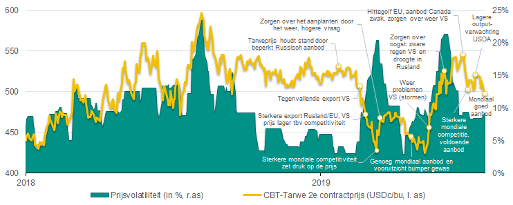 In het huidige seizoen 2018/19 krimpt de totale productie met bijna 4% met name door de uitdagende weersomstandigheden. De consumptie blijft stabiel. Daarmee nemen de voorraden af en dit betekent dat de tarweprijs kan herstellen richting eind 2019. Het marktbeeld kantelt echter in het seizoen 2019/20. De International Grains Council (IGC) verwacht namelijk dat de productie in het nieuwe seizoen met bijna 5% gaat groeien. De productie van tarwe in de VS dipt naar verwachting. Dit komt door vertragingen in de oogst door nat weer en minder beplantingen. De productie neemt echter sterk toe in Australië, Oekraïne en Rusland. De yields nemen toe.
